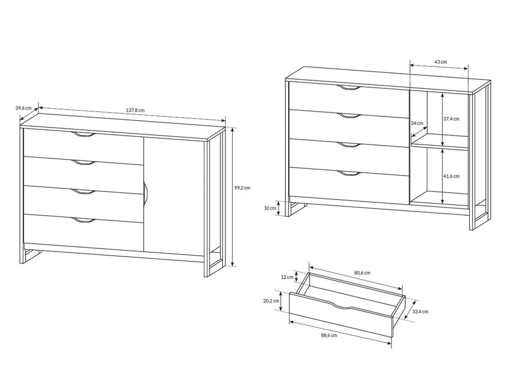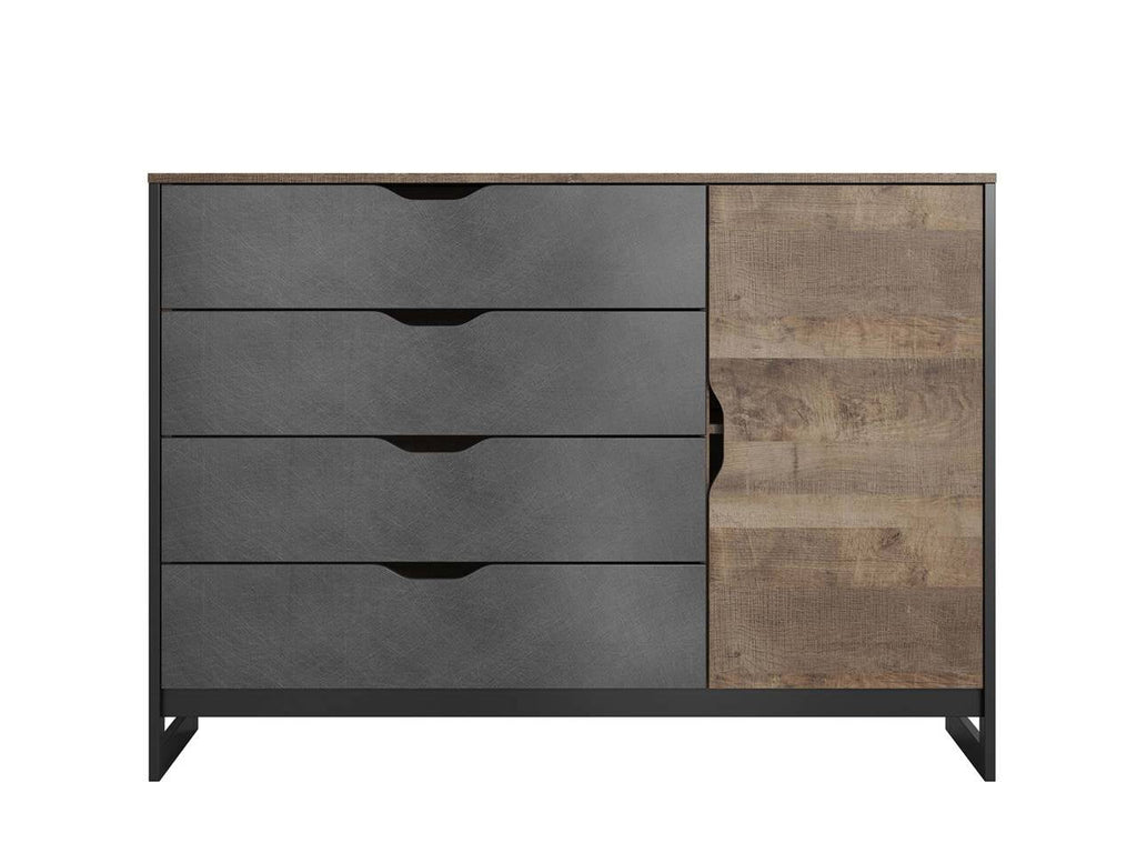 The Lask ARDEN 138 sideboard is a bold, functional addition to any modern or industrial-style interior. With a patchwork oak finish, distressed dark grey metal accents, and a black plywood frame, it brings raw texture and design depth to your space. Featuring four drawers and a cabinet with an internal shelf, this sideboard offers both open and hidden storage for everyday use.