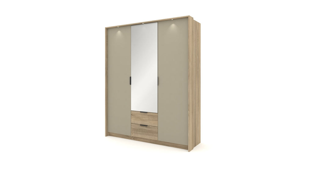 Designed for smaller rooms without compromising on storage, the 3-door Lask Letto wardrobe combines practical design with a bold, contemporary look. The dark Terra Oak finish, paired with Stone Grey doors and subtle black metal handles, brings contrast and character to the bedroom. With a clever internal layout featuring both hanging rails and shelves, as well as two full-extension drawers with soft-close glides, this piece is ideal for organizing everyday wear and personal belongings. Optional ambient LED lighting integrated into the decorative trim makes it a functional showpiece even in dim settings.