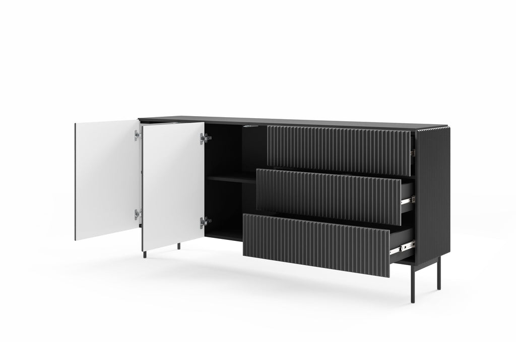 This mid-sized sideboard offers a perfectly balanced layout: two spacious cupboards and three soft-close drawers for varied storage needs. The black fluted fronts bring a sense of movement to its otherwise minimal profile, while the metal legs ensure lightness and architectural poise.