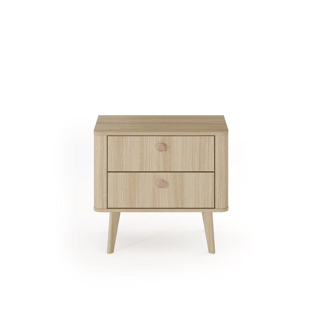 The Viki bedside table combines subtle sophistication and functionality in a compact form. With two spacious drawers for personal items, a durable Barista Oak body, and mocha-accented wooden handles, it effortlessly complements the rest of the Viki bedroom line. Each drawer opens smoothly thanks to ball-bearing runners and features white HDF interiors. Supported by elegant wooden legs and finished with curved MDF accents, this table adds a polished and practical touch beside any bed.