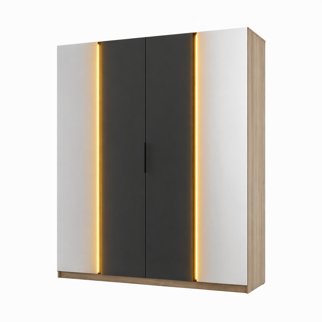 The sturdy carcass made of 16 mm laminated board in evoked oak finish, protected with durable ABS edging, ensures strength and resistance to daily wear. The black HDF back panel reinforces the construction and improves overall stability. With a total weight of approximately 230 kg, the wardrobe reflects high manufacturing quality and solid craftsmanship.