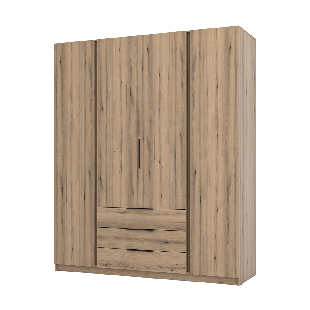 The KAJA EV/EV 4F 3S wardrobe offers a spacious and sturdy storage solution for clothes and accessories. Perfect for bedrooms, dressing rooms, or open-plan spaces, it brings elegance and a warm, natural wood character to any interior.