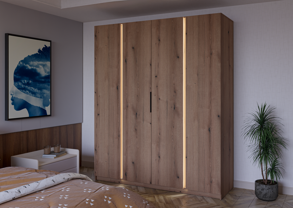 Inside, the wardrobe offers a spacious and well-organized storage area behind four full-height doors, providing generous space for clothing, accessories, and household textiles. The simple and functional internal layout focuses on maximum storage capacity and everyday convenience.