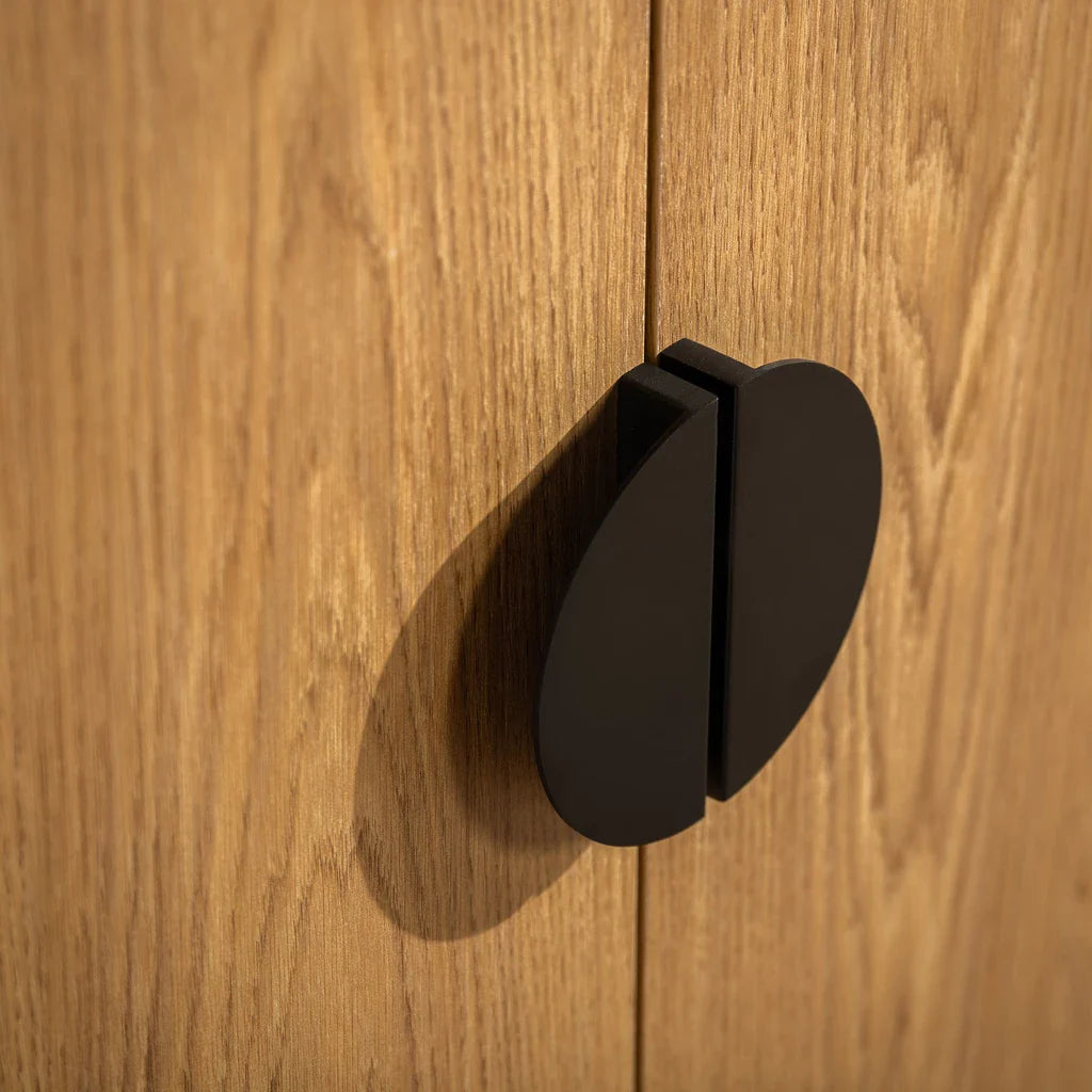 Rounded black metal handles contrast beautifully with the light wood tones, adding a contemporary touch.