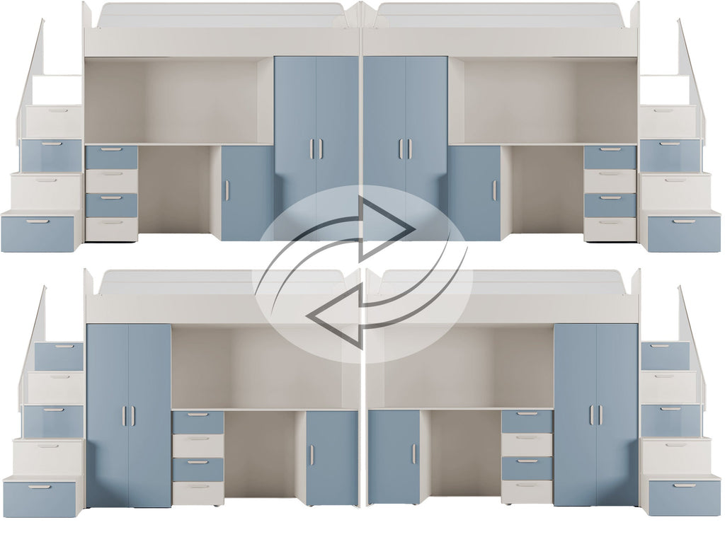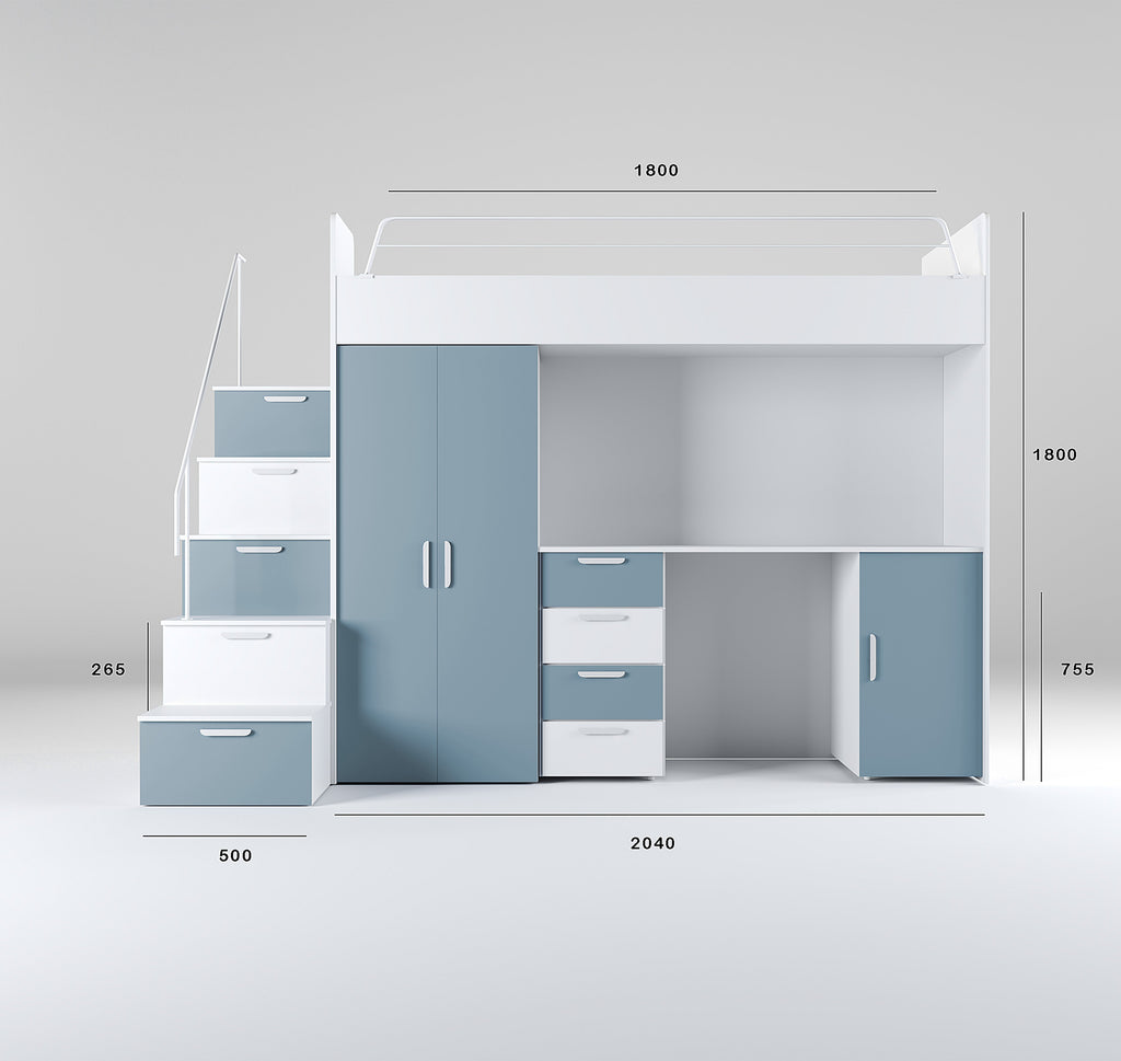 The integrated desk, spacious wardrobe, and practical stair drawers help keep the room tidy while providing safe and comfortable access to the upper bed.