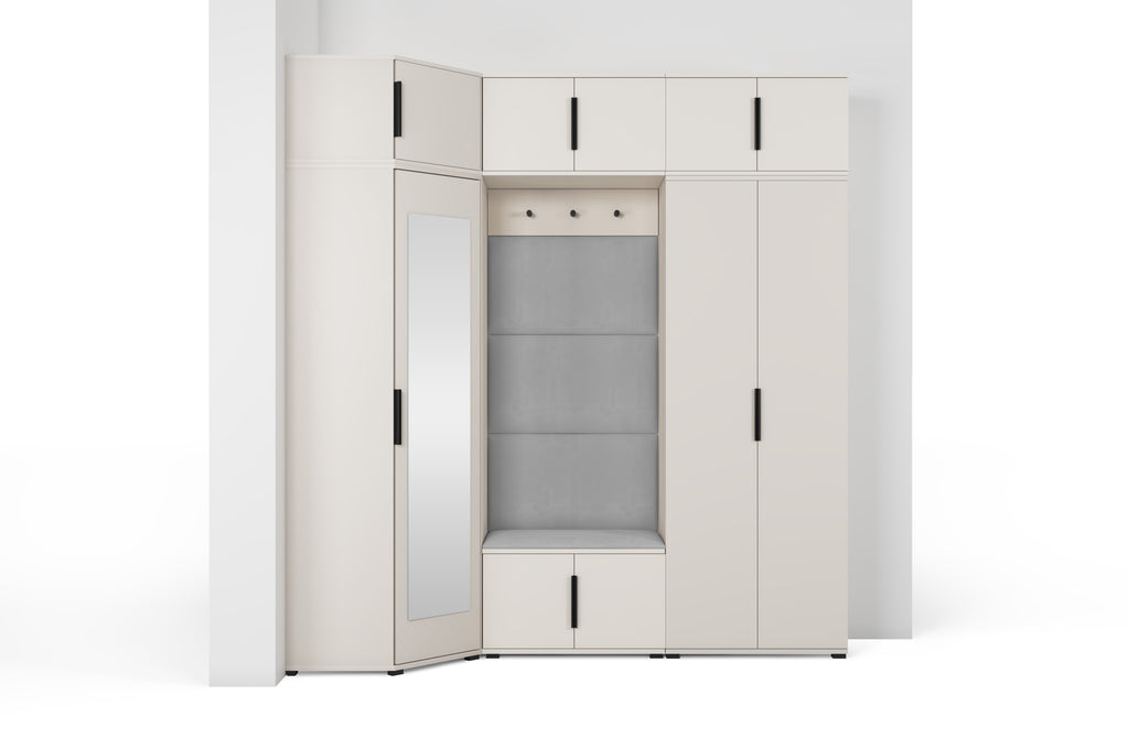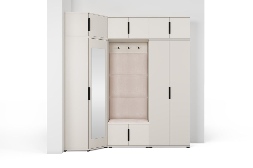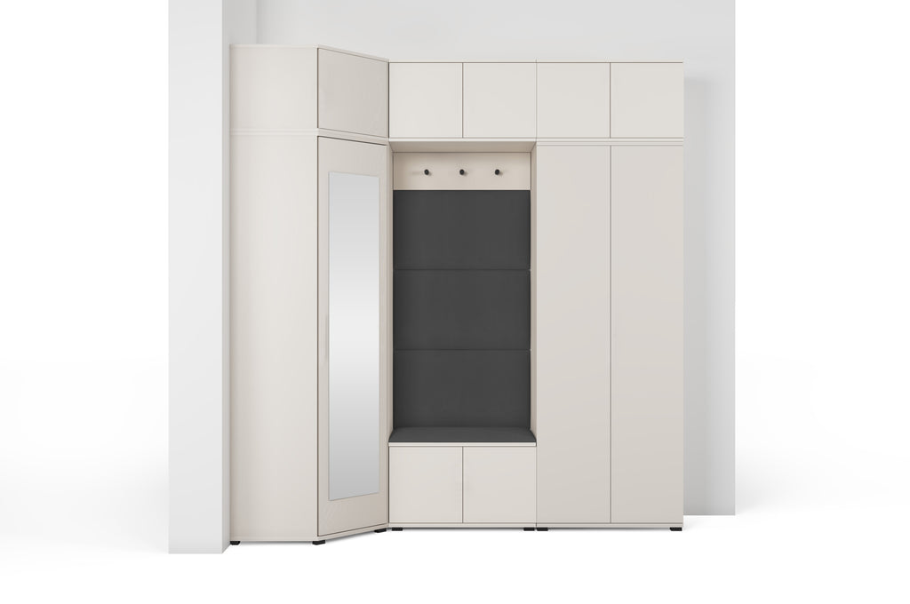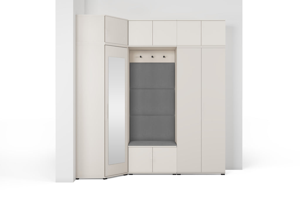 The subtle Cashmere shade adds warmth and lightness to the interior, while the minimalist design blends beautifully with modern décor. The centrally placed niche with a comfortable seat and upholstered panels creates a cosy zone — perfect for putting on shoes or getting ready to go out. The full-height mirror on the wardrobe front not only makes daily grooming easier but also visually enlarges the space.
