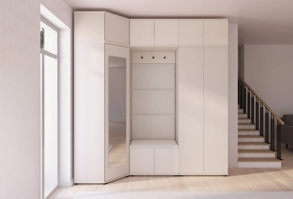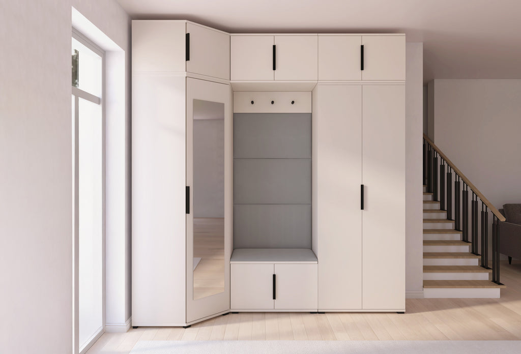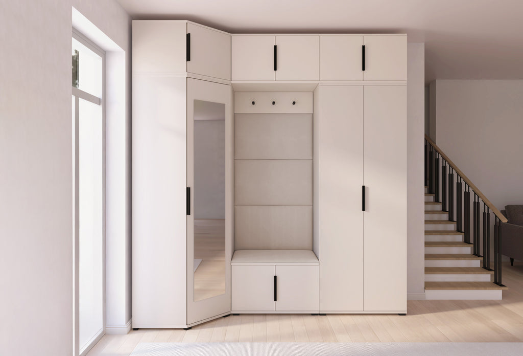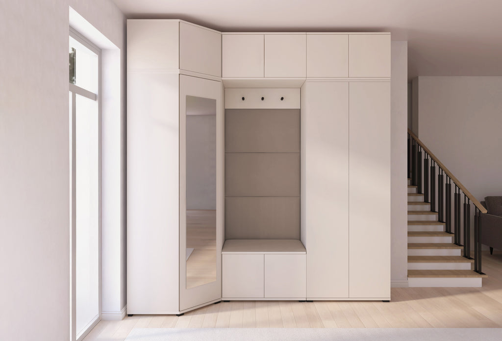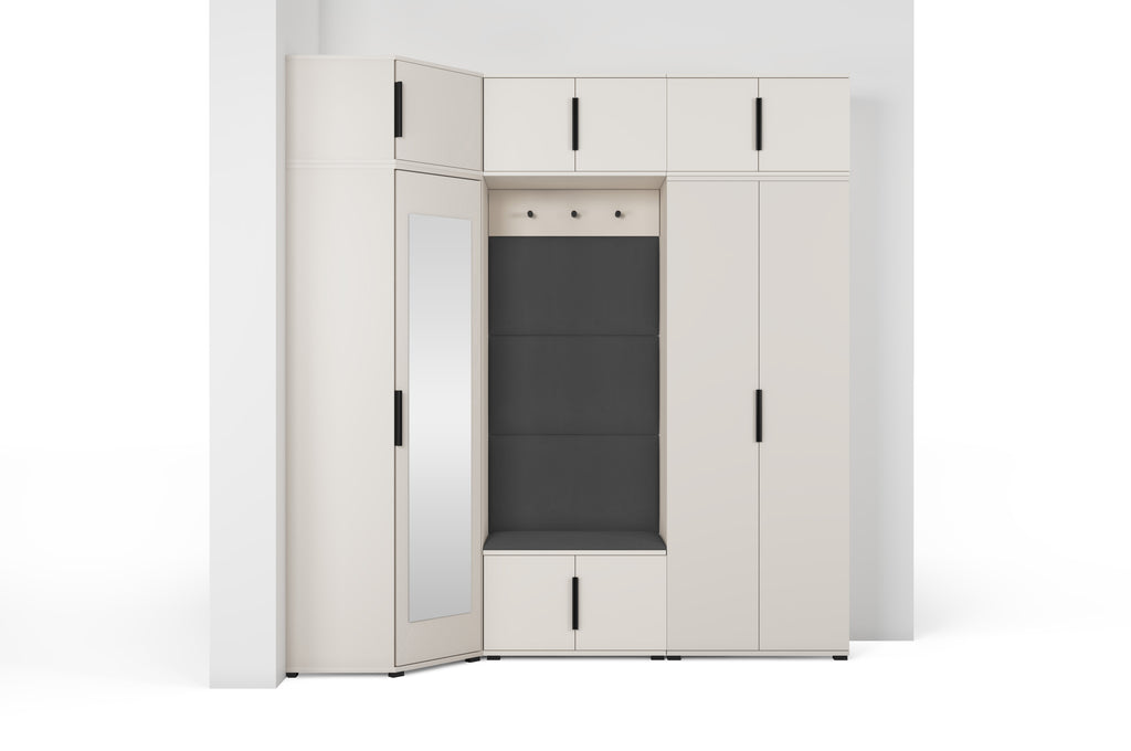 The subtle Cashmere shade adds warmth and lightness to the interior, while the minimalist design blends beautifully with modern décor. The centrally placed niche with a comfortable seat and upholstered panels creates a cosy zone — perfect for putting on shoes or getting ready to go out. The full-height mirror on the wardrobe front not only makes daily grooming easier but also visually enlarges the space.