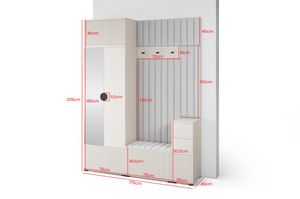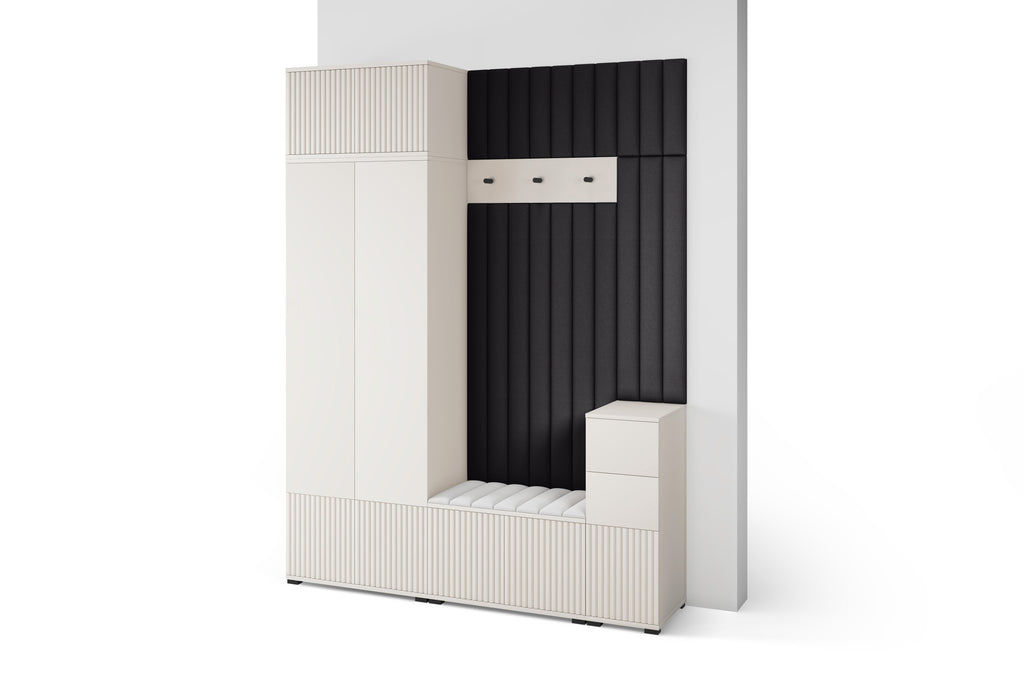 A modern hallway set in elegant Cashmere colour with milled fronts, available with or without a mirror. The design is handle-free, stands on low black legs, and is complemented by upholstered panels in Trinity fabric, creating a refined and welcoming entrance space.