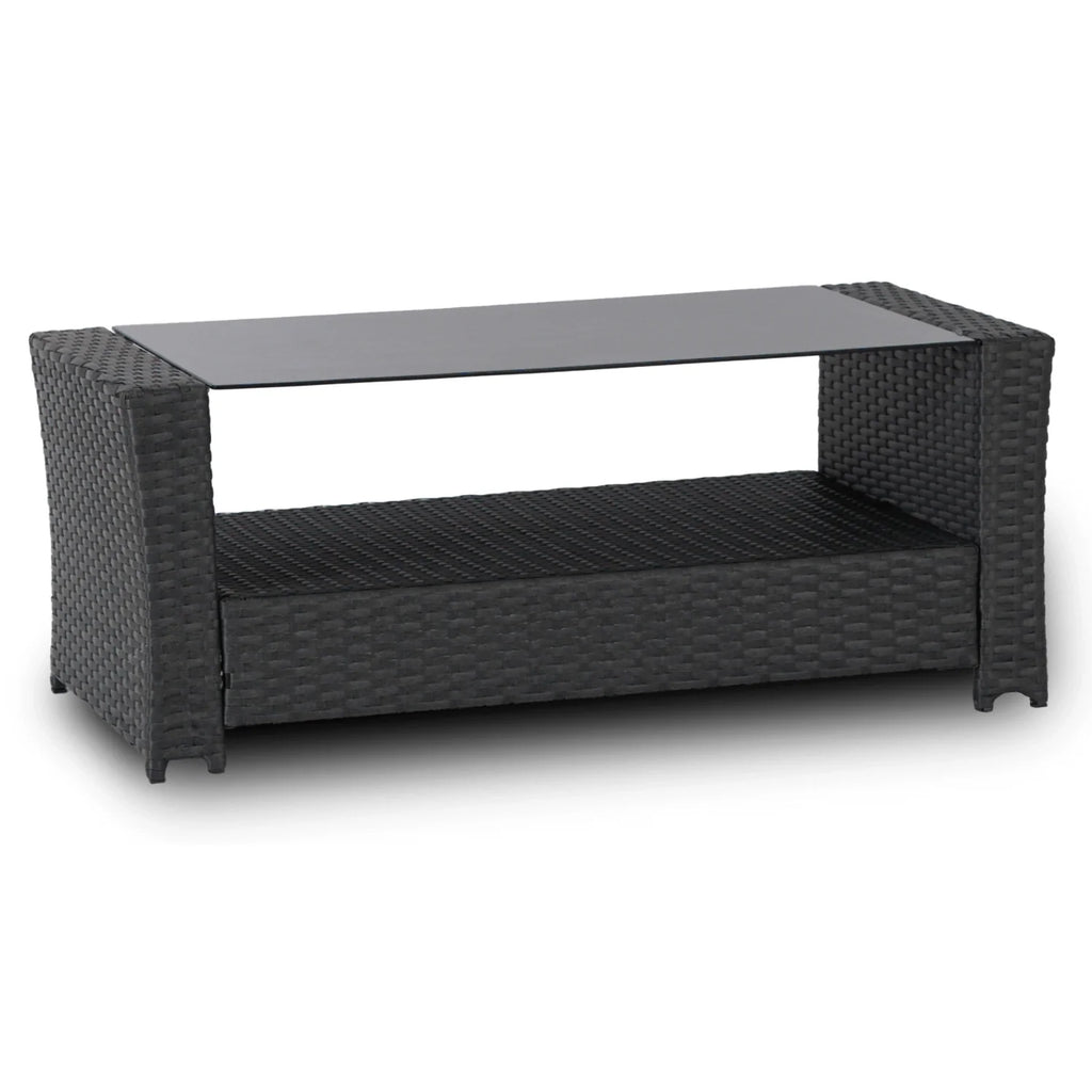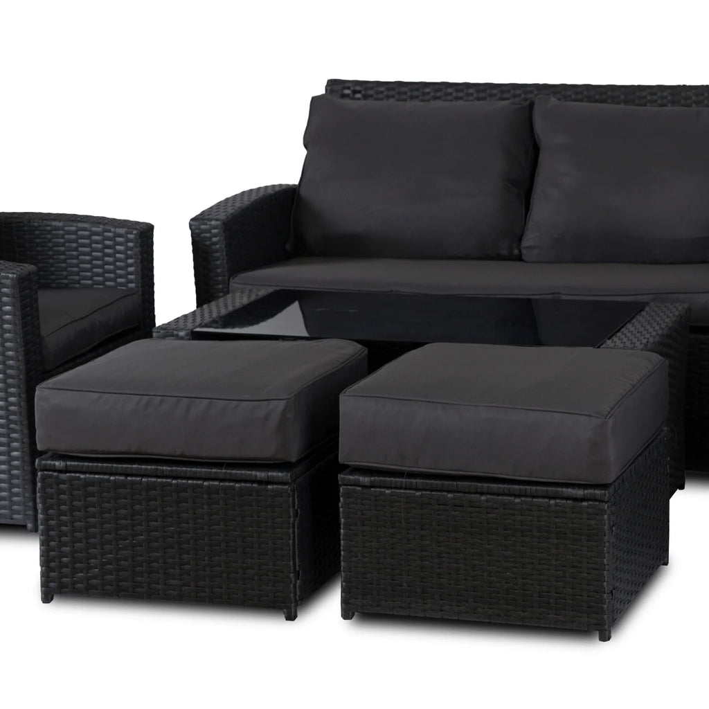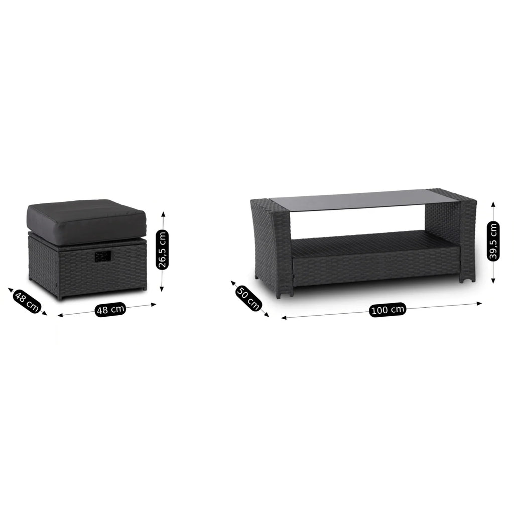 Ein eleganter dunkelgrauer Rahmen mit eleganten schwarzen Kissen ergänzt jede Außendekoration. Der rechteckige Couchtisch mit Glasplatte verleiht einen Hauch von Eleganz.