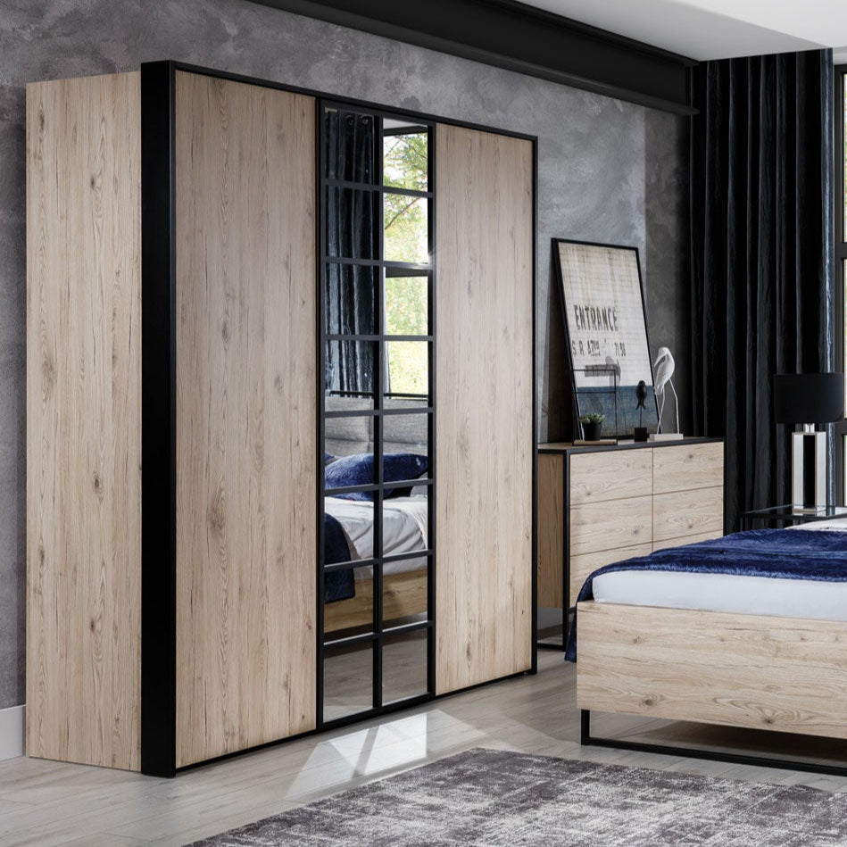 Das Herzstück dieses Kleiderschranks ist die mittlere Spiegeltür, eingerahmt von einem pulverbeschichteten schwarzen Metallgitter, das den Spiegel in 16 quadratische Paneele unterteilt – eine auffällige Anspielung auf die Lagerhausarchitektur. Ein breiter schwarzer Dekorrahmen umgibt die Front und harmoniert wunderbar mit den dunklen Tönen des Metall- und Holzdekors.