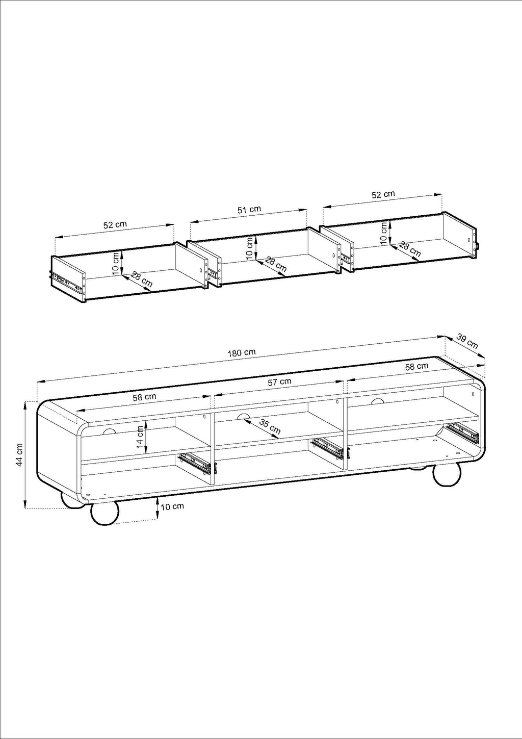 - Offene und geschlossene Bereiche: Der RTV-Schrank kombiniert die Funktionalität geschlossener Schubladen mit offenen Regalen und ermöglicht so die bequeme Aufbewahrung sowohl von Alltagsgegenständen als auch von Dekorationsartikeln.